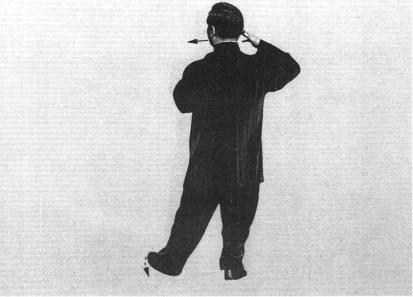 右脚不动,左脚掌微收。同时,右拳变掌, 由下向上划弧至右太阳穴一侧,掌心向内;左 掌由上向下划弧横至右胸前,左肘弯曲大于90。 (图 34)。
