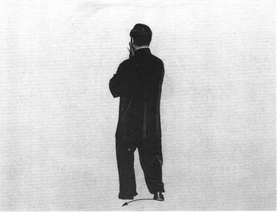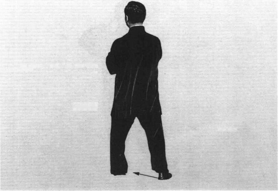 上身姿势不变。右腿弯曲不变;提起左脚向 前蹬铲出步,脚跟着地,脚掌翘起,左腿自然伸 直(图35)。