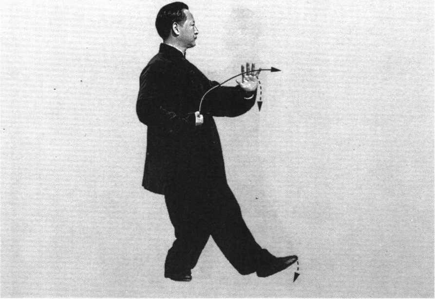 上身姿势不变。右腿弯曲不变;提起左脚向 前蹬铲出步,左腿自然伸直,脚跟着地,脚掌上 翘(图48)。