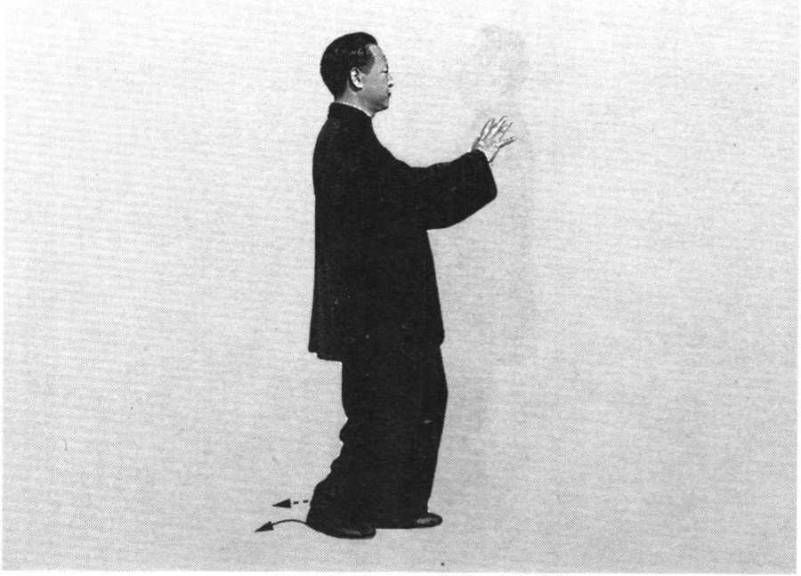 重心前移至左腿,提起右脚向前上步,重心 移至右腿;左脚随即上步至右脚的左前方,脚跟 提起,前脚掌点地。同时,右拳由上向下落至右 腰侧;左拳变掌上举至右胸前成立掌,掌心向 右,掌指朝上,左肘弯曲大于90。(图47)。