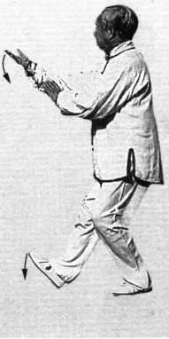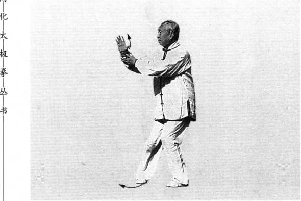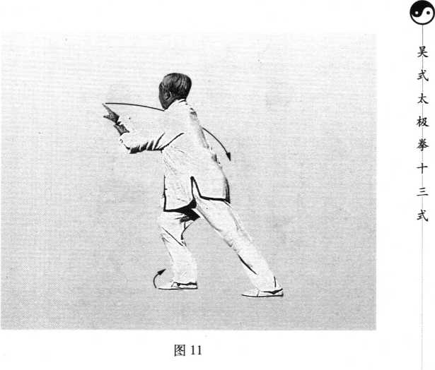 左脚以脚跟为轴脚尖内扣约45。;右腿向右上 步,脚跟着地,成右虚步。同时,立身上体右转。右 手随之经左手拇指上方向右划弧,渐转渐翻掌外 旋,沉肘置于面前,手心向里,指尖斜前上方,拇指 对鼻尖;左手内旋翻掌,附于右前臂内侧中间,手