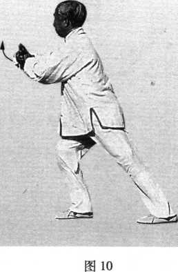 心向下,食指尖与右手拇指斜相对成一斜线,腕与 胸平。眼看右手,意在右掌掌心(图8、9)。