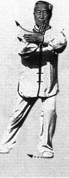 重心移到右腿;左脚向前上步,脚跟着地。 同时,两手领臂经外向前上方、向里划弧合抱至 胸前,左掌心向里,指尖斜向右前上方,大指对 鼻尖;右手附于左前臂内侧,手心斜向下,食指 尖与左手大指斜相对成一斜线,腕与胸平,两臂微 屈。眼看左手,意在左掌心,成左虚步(图6)。