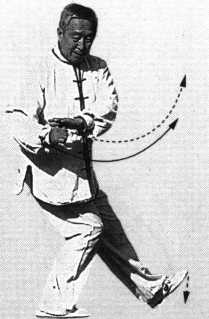 掌拳相合斜上搠,送臀沉胯脚落平;