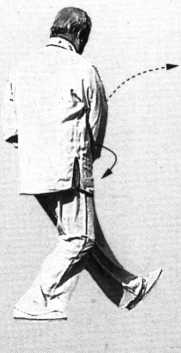 要点:右拳外转肘为轴,左膝提进脚跟落;