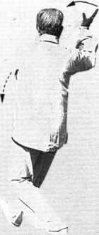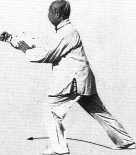 左腿屈膝,重心下沉前进,成左正弓步。同 时,右掌变拳,向体前斜下方伸打,拳高于腹, 拳眼向上;左手屈臂回捋附于右臂内侧。身法斜 中正。眼看右拳,意在拳面(图57 )。
