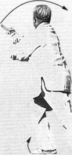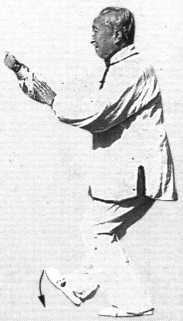 重心前移,提右膝经左腿内侧向右前方上 步,脚跟着地,成右隅虚步。同时,右拳外旋, 向斜上方,拳心向上;左手附于右前臂内侧。眼 看右拳(图58、59)。