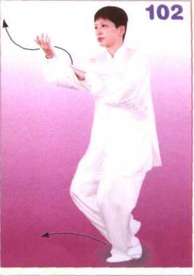 重心移至左腿,上体左转;左腿 屈膝;右脚屈膝提至左小腿内侧;同 时,右手外旋,手心向上,经腹前向 上沿左前臂下穿出;左手内旋,屈肘 附于右前臂内侧;眼看右手。(图 102)