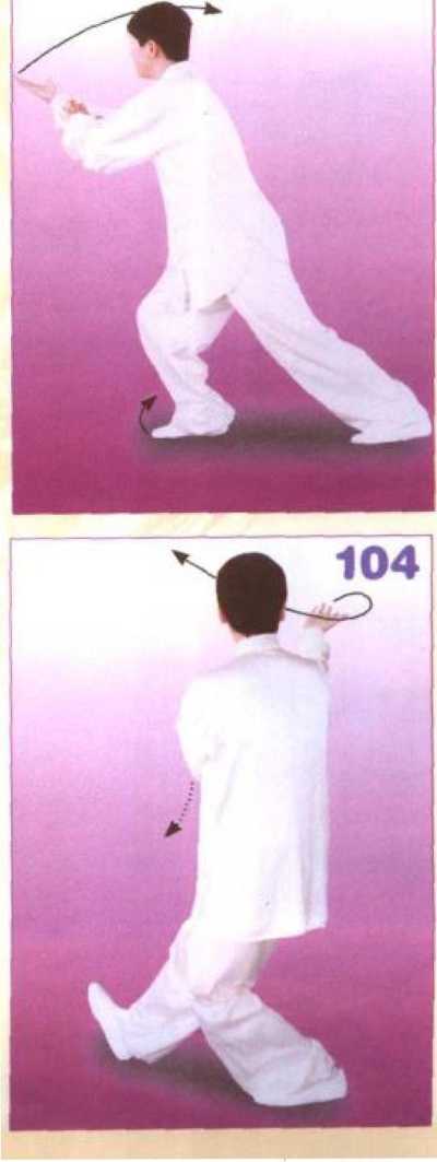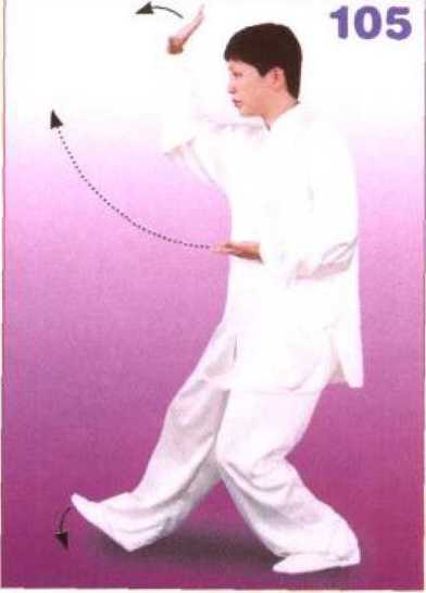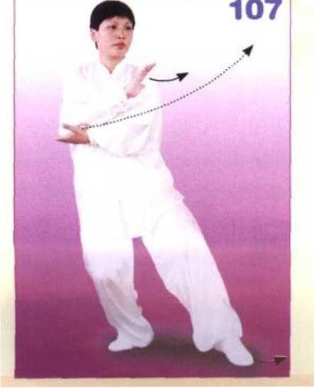 103 |103 |左腿屈膝,重心后移,右脚尖翘 起;上体右转,随之右手屈臂向右旋 腕,至肩右前上方,手心斜向上;接 着,上体左转,右手再内旋屈肘上举 至右额前;左手收于左腰间,手心向 上;眼随视右手,最后看右前方。 (图 104、105)