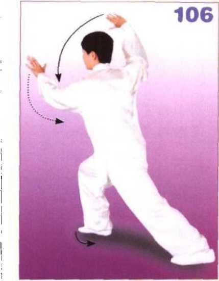 右脚尖落地踏实,重心前移成右 弓步;上体右转(胸向西北);同时, 左手向前推出,腕与肩同高,肘微屈; 右手屈肘架于额右前上方,手心斜向 上;眼看左手。(图106)