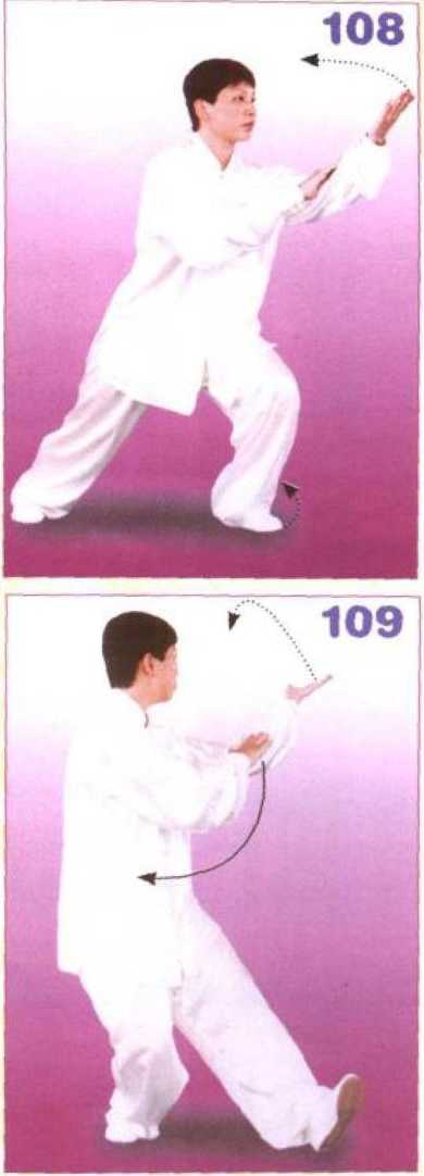 左脚稍向左前方移步,全脚掌踏 实,重心前移成左弓步;同时,上体 左转(胸向东南);随体转左手向左、 向前、向上划弧伸出,腕与肩同高, 手心斜向上;右手向右附于左前臂内 侧;眼看左手。(图108)