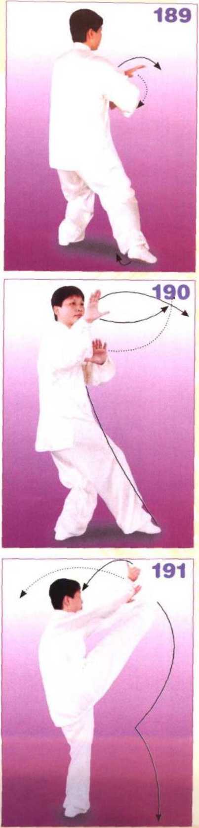右腿伸直向左、向上、向右划弧 摆起;当右脚摆至胸前时,左右手向 左依次拍击右脚面;眼看拍脚方向。 (S191)