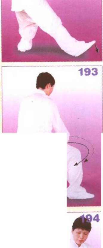 两腿屈蹲成马步,同时,两手经 体左侧,手心向下落按于腹前;动作 不停,重心右移,上体右转,随转体 两手经体前向右划弧至右膝侧上方; 眼看两手。(图193、194)