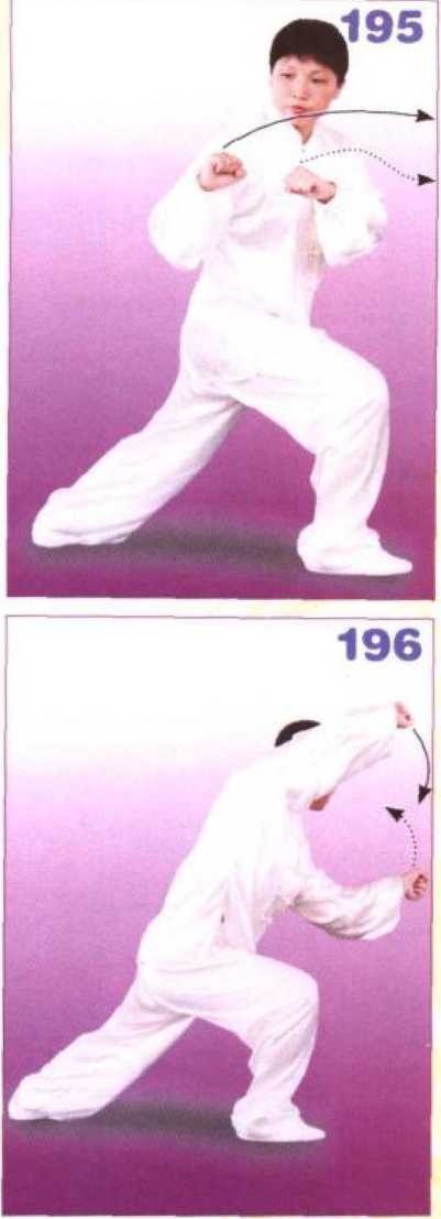 上体继续向右拧转;右臂屈肘, 右手变拳提至右肩前,拳心向下;左 臂屈肘,左手变拳提至右胸前,拳心 斜向下;眼看右侧。(图195)