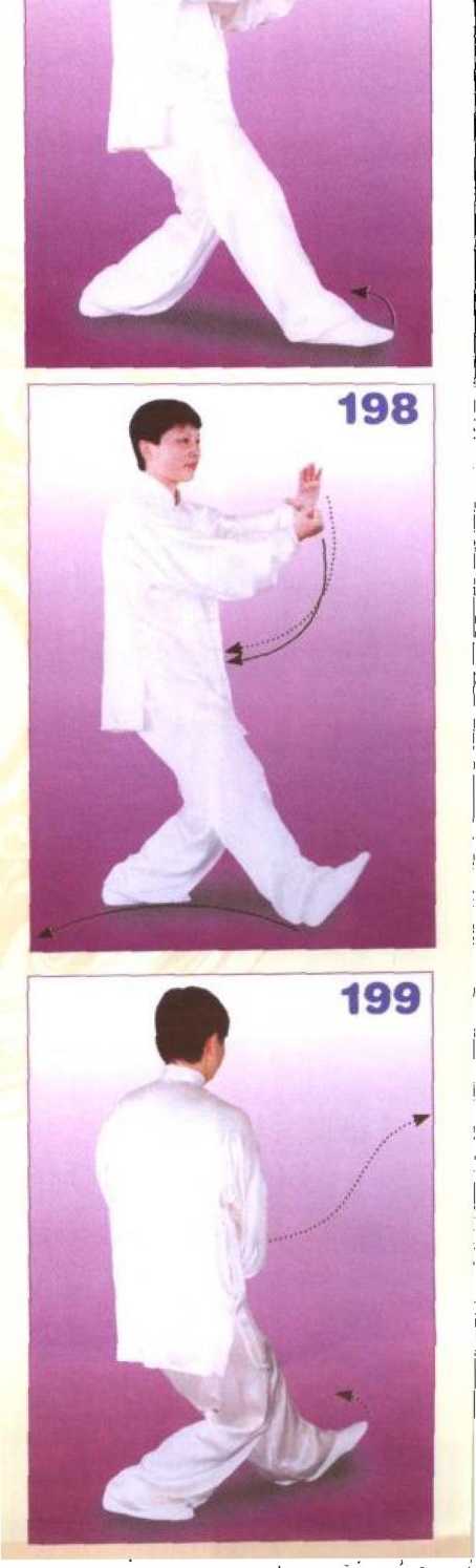 右脚向后撤一步;重心后移,上 体微左转;随之两手向下、向左划孤 收至左胯前;眼看左手。(图199)