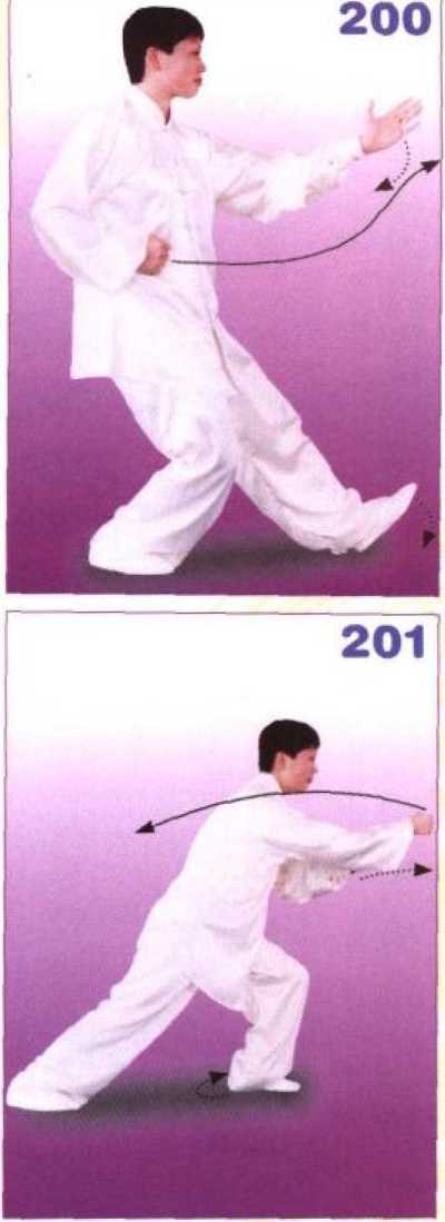 左脚尖落地踏实,重心前移成左 弓步;同时,右拳向前打出,拳与胸 同高,拳眼向上;左手附于右手前臂 内侧;手心斜向内;眼看右拳。(图 201)