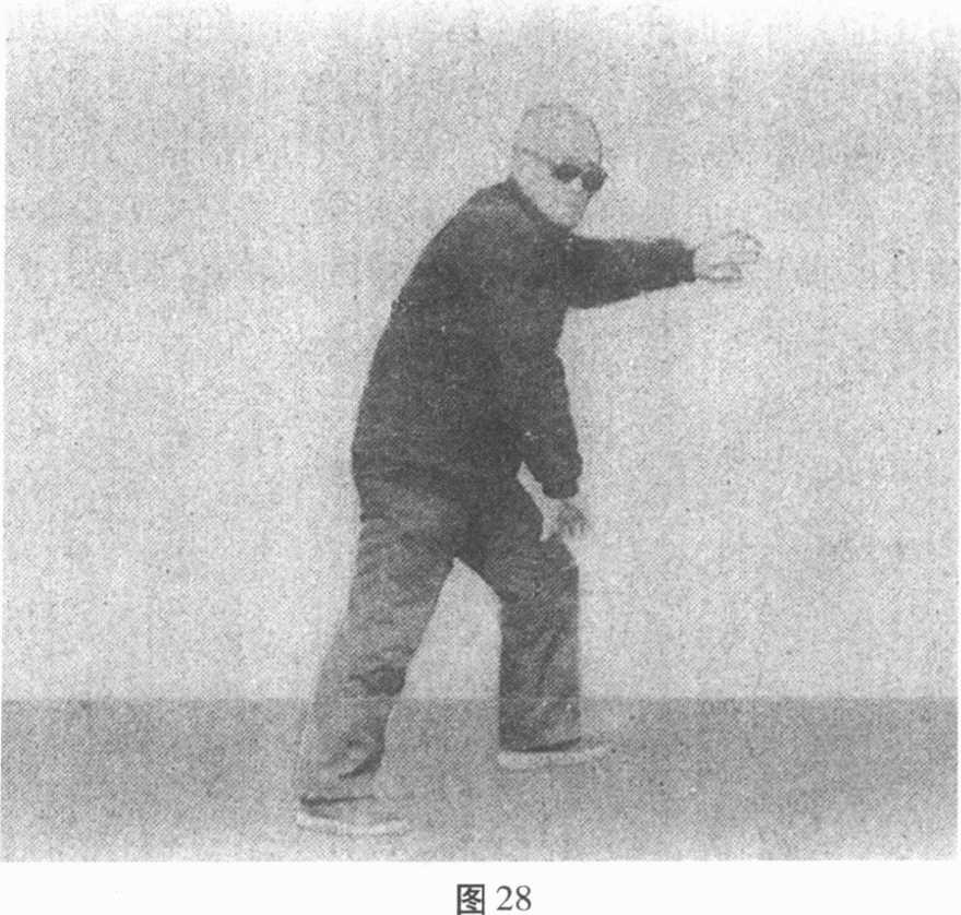 (2)左脚向左后斜角退一大步,两手转身成俯掌, 右掌从左掌心之下伸向左掌之前。继而向左侧身向后 退,置重心于左腿,右腿伸直,身体右侧与右腿成直线。 于是先右脚、后左脚,相继将脚尖转向正北,身体随之 转向北方偏东,左手随势放下,经身后向上绕至左颊上 侧,成指尖向东的反掌,右手同时放下,经转臂成指尖 略与左膝盖对齐的俯掌,眼视正东(图28)。