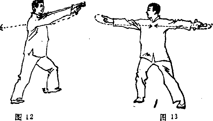 朝下,小指反朝天,剑铛紧贴脊背。同时,上体向右转成9例 (面向正南):右脚脚跟虚悬后转,使脚尖转向南,随后屈 膝略蹲,体重寄于右腿;左腿伸直,左脚脚尖也转向南,左 右脚形成右铺步.上体直立,两眼向前(正南)平远视(图 12、图13).