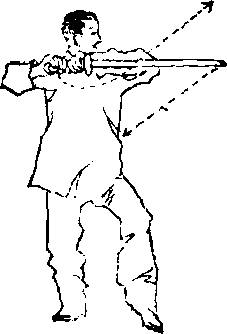 如对方以械朝我下腹部或腿部击来,我则先以剑镖封格 其械,随之,进左步并以右诀指朝对方前胸心窝处或腋下神 经处发劲戳点.