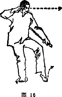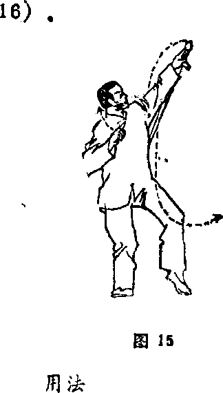 松右肩,坠右肘,使右诀指靠近右耳。同时,左手剑使 剑舞朝天、向左前上方横拨,随即转移向下,也往左前下方 横拨。这时左臂下垂靠近左膝外侧。剑舞朝地,剑锋朝天. 步子不动,仍成胯虚步.眼神始终追随剑舞运转(图15、图