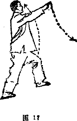 空手剑屈臂上提,使剑朝天.虎同靠迎顾前.博时, 右诀指直臂向右前下方,掌心朝下,步子不动仍为左弓式. 眼神注视右诀指(图18).