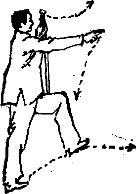 左脚向左前方迈进一步,随之屈膝前拱,右脚在后,服 窝肌腱舒直,体重移于左腿,两脚成左弓步。同时,右诀指 直臂向前伸出e左手剑直臂下垂,使手背靠近左膀,剑^朝 地,剑锋朝天,上下保持形成一直线.两眼向前晋远视(图 17).