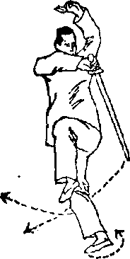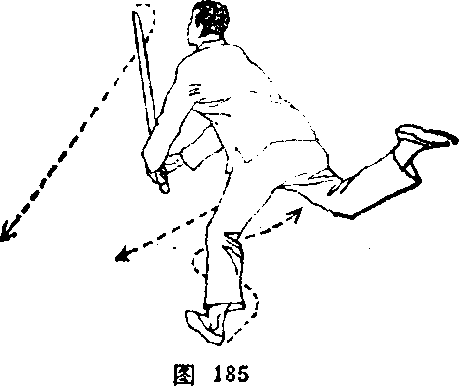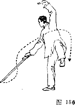 右手剑以剑锋引导由上往前(西北)下方直臂点词接近 地面;左诀指朝头顶左上方直臂伸展。同时,右脚向前方(西 北)迈进一步,,落实支撑体重,左脚屈膝提起垂悬不落。眼 神注视剑锋(图186)。