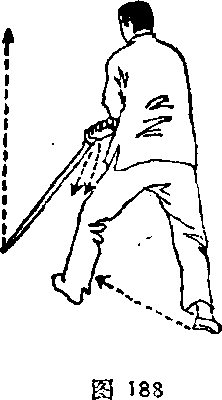 形成左弓式,体重在左腿,眼神注视剑锋(图187、图188兀