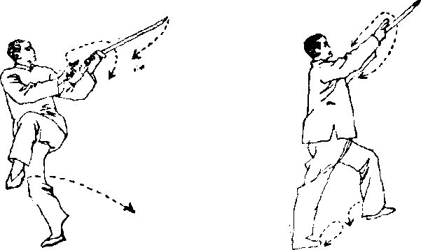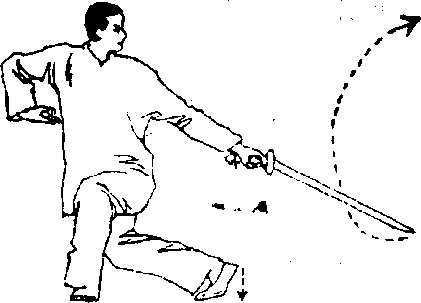 右手剑交于左手,右手捏好诀指,以指尖紧贴右肋间; 左手握剑,以剑锋引导由北经过正西、正南至正东走弧形, 平直臂展开。剑镯朝天地,剑锋“朝正东方,接近地面.同 时,右脚从身后向左移动到左脚的左后方落下,脚尖着地, 脚跟提起,体重移至左腿,两腿成背步.眼神注视剑锋(图 212)。