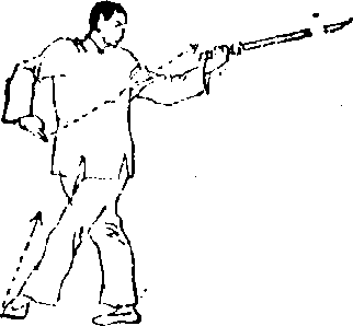 对方以械击我头部,我即抬臂举剑先击敌持械之臂之 后,再往加进身,以剑取敌右眼.