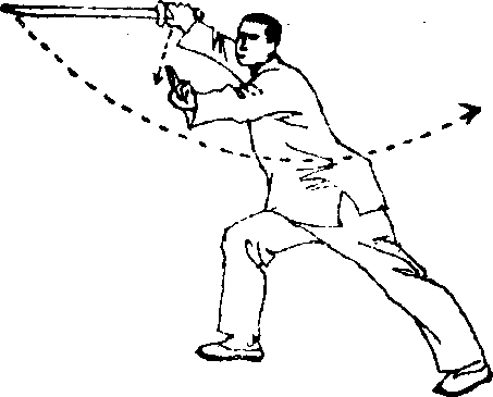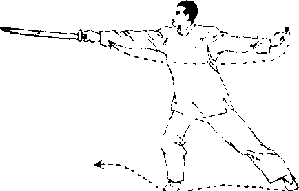 右手剑手心翻转向上,直臂向前送出;左诀指从身后移 至身前扶于右脉门处。相触之后,两手手心均朝上,立即又 分向身体两侧,随同身体的转动,使剑锋由西北向右转动约