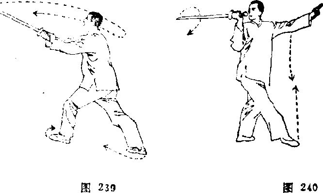 271 I即剑锋转向西南);左诀指臂微屈指向东北.同时. 左脚向前进一大方,脚尖里扣;右脚脚跟随着身体的右转而 转向后,脚尖朝东偏北。两膝内侧相贴.体重移生左腿.眼 神仍视剑锋.(图239、图240).