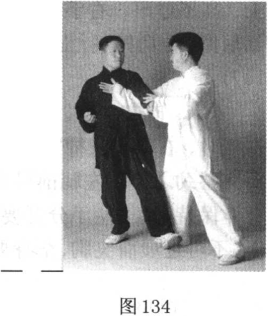 动作3:左足向前跟至右足跟左后方,足尖着地,两腿为右实 左虚,同时两手内合,目视前方(图134)。