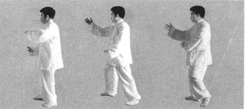 要点:两手与胸腰要有相吸相系之 意,使之产生杠杆和圆的作用,上步时身 体要稳,两手运动要有圆活之趣,以目光 领先。