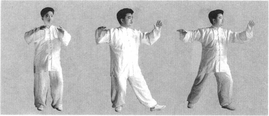 动作2:左足向左横跨出一步,足跟着地,足尖上翘,同时两 手徐徐向左右分开,两手与两足上下合齐,目视左手(图136)。