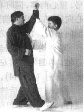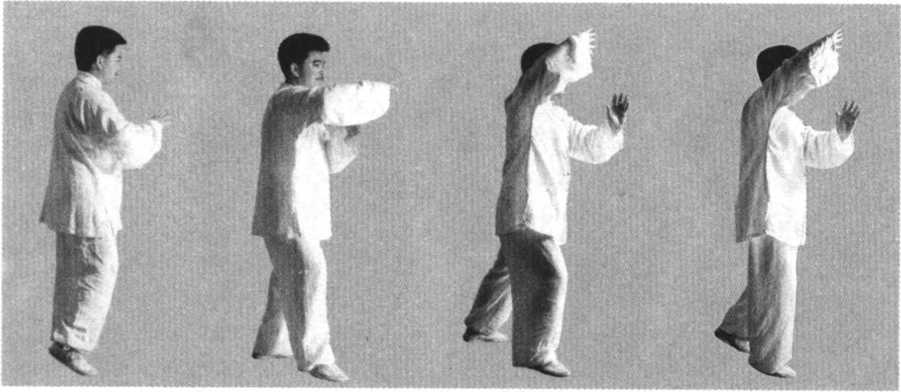 动作4:左足跟至右足跟左后方,足尖 点地,两腿为右实左虚,同时两手微内合, 面向东南(图144)。
