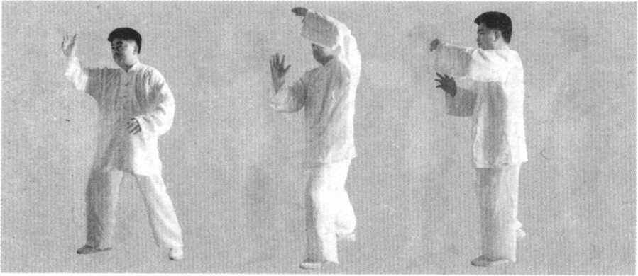 动作3:右足向东南迈步,足跟着地,足尖上翘,随即右腿前 弓,重心前移,同时右手挪至额前上方,掌 心向前,左手由胸前竖掌坐腕从胸前推出, 面向东南,目视前方(图143)O