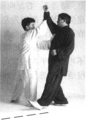 动作2:右足跟至左足跟右后方,足尖着地,两腿为左实右虚, 同时两手内合,面向东北(图146)。