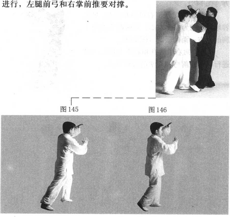 图144图144图141 图142 图1芯图141 图142 图1芯要点:向右后转身和右手上捆要同时 进行,右腿前弓和左掌前推要对撑。