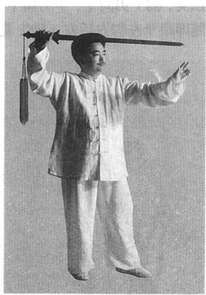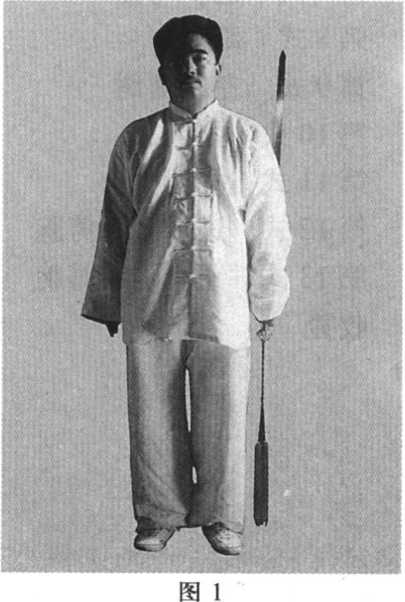 动作1:身体开立步站立,面向正南,二目平视,左手持剑, 掌心向后,剑脊背竖贴于左臂后,剑尖向上。右手位于大腿右侧, 掌心向里,手指向下。两腿站立时要自然安舒,气向下沉,精神 上提,身法要求与拳架身法要求相同,后不重述(图1)。