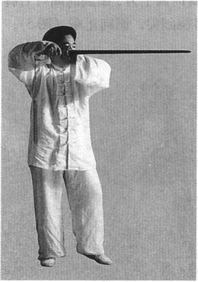 动作2:右手剑继续从右下方向左前拥起,左手剑指合按于 右手腕内上面,以右手腕为轴,剑尖上挑于小腹至咽喉高度,力达 剑尖,剑上刃向上,下刃向下,剑尖斜向前上方,绷剑的同时右脚 随即跟至左脚右后方,脚尖着地,目视剑尖,面向正东(图5)。