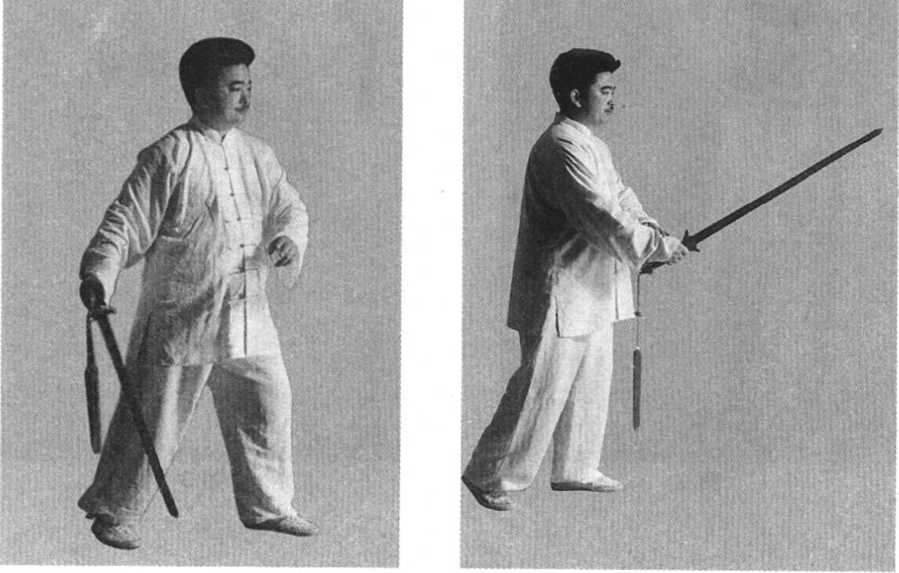 动作1:右脚尖微上翘,脚跟为轴,脚尖内扣,重心仍在右 脚,左脚向东北方向迈出,左脚跟着地,重心渐移至左腿成左弓 步,两脚为左实右虚。右手剑下刃向右后下劈落至身前右下方时 内翻手腕,上刃向左,下刃向右,剑尖向下,左手剑指回收于胸 腹之间(图4)。