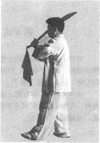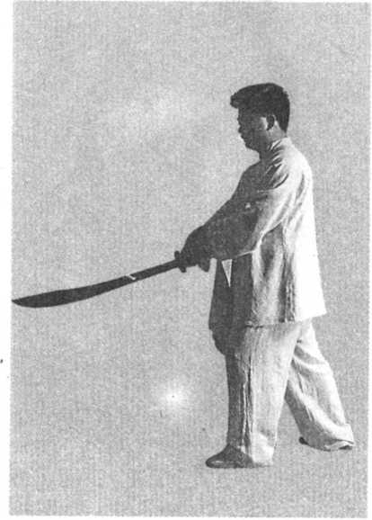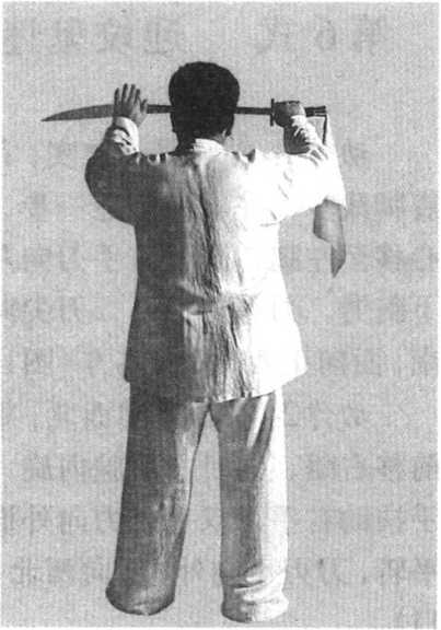 动作:以右脚跟为轴,脚尖 内扣,腰带身体向左转,面向正 西,左足跟着地,同时右手腕外 旋,右手刀背扛右肩,刀刃向上, 刀尖向后,左手扶在右手腕上,目 视西方(图9)。
