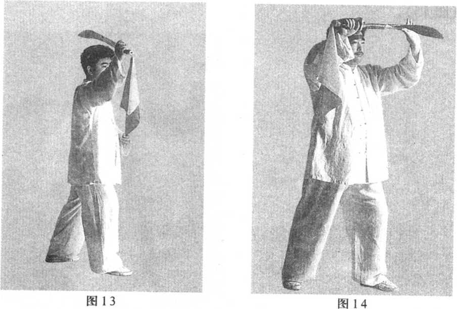 动作4:刀随步转,右手屈臂上抬,左足尖内扣,右脚外摆, 重心由左腿前移右腿,刀平斩一周,内翻腕上举,缠头裹脑,面 向东南(图13)。