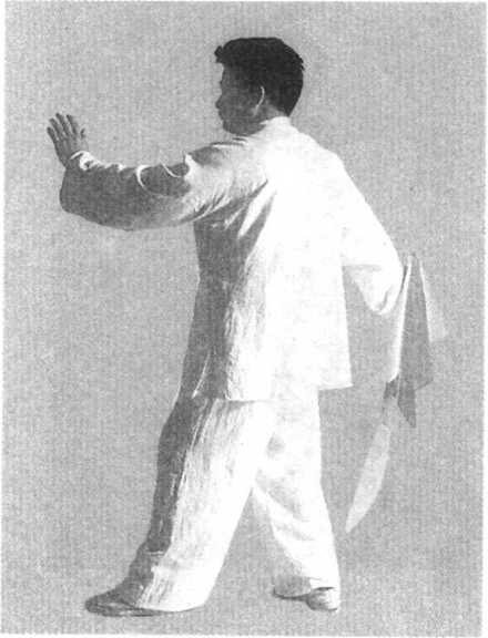 动作:全身跃起向右转至面向正西,两脚同时落地,跺地震 脚,左脚虚踏,仍左脚在前右脚在后,身体重心坐在右腿,同时 右手刀向后甩,刀尖向下,刀刃向后,左手向前推掌,目视前方 (图 15)。