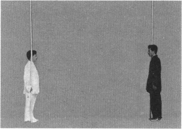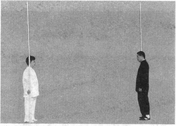 动作1:甲乙(图左边为甲,白装;右边为乙,黑装)双方 相对站立,各以右手执杆,杆竖立于身体右侧,杆尾端着地,位 于各自右脚外侧,杆尖向上,自然直立,两人中间距离以杆的 长度而定,目视对方(图23)。