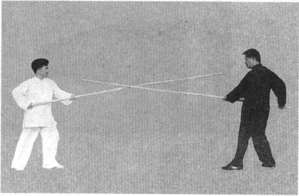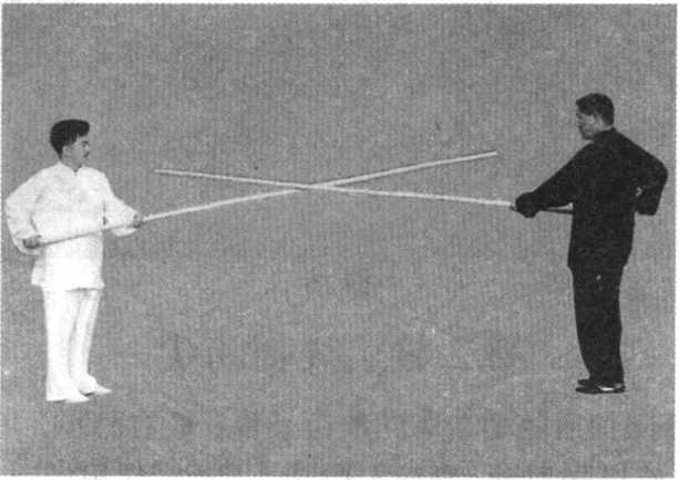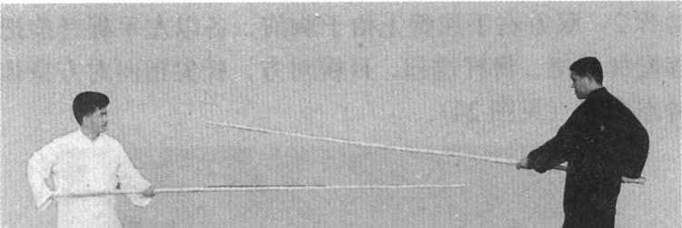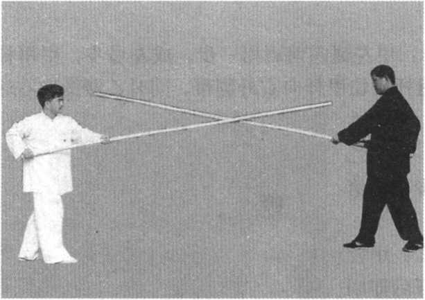 两人应杆不离杆,如同粘在一起一样,甲进三步半刺乙后,改 变成乙进三步半刺甲,如此循环,掌握粘连黏随,不丢不顶,使 杆身杆尖虚实化发之劲与我周身的虚实化发之劲溶为一体为最佳 效果。