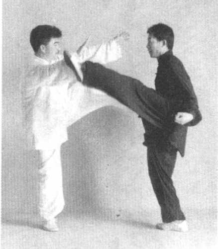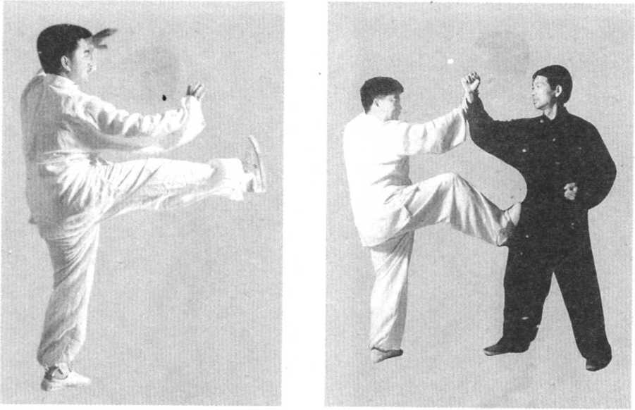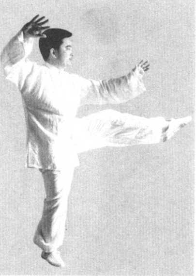 动作2:左足向前上方踢出,左足之背要崩平,意念要贯穿 到足尖,两掌同时左右分开,左手略高于肩向前推出,右手分至 头右上方,外撑含撷劲,仍面向正东(图138)0
