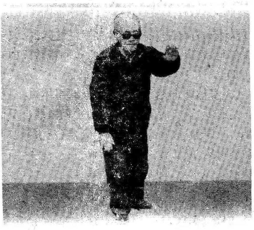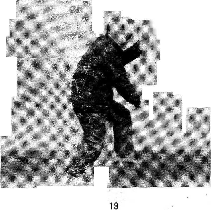 (2) 身体略向后坐,右腿屈膝承担体重,左腿 伸直成虚步。于向后坐身同时,左手边转小臂边收 至左颊旁,成掌心向里的斜立掌(图19)。右拳放 开,随势收至胸前,成立掌。然后左脚后退一步半, 左手同时转成侧掌后,即边转小臂边向前伸,至臂 部基本伸直时转成正掌。右手同时下按搂膝,置于 右膝右侧,成指尖向前的俯掌。身体和视线仍向东 (图 20)。