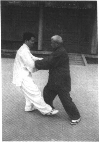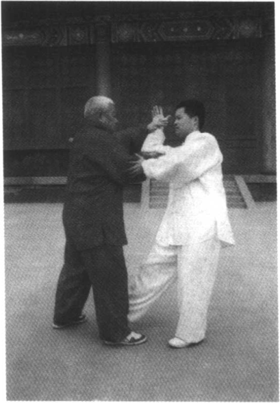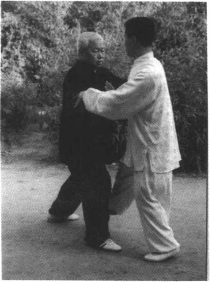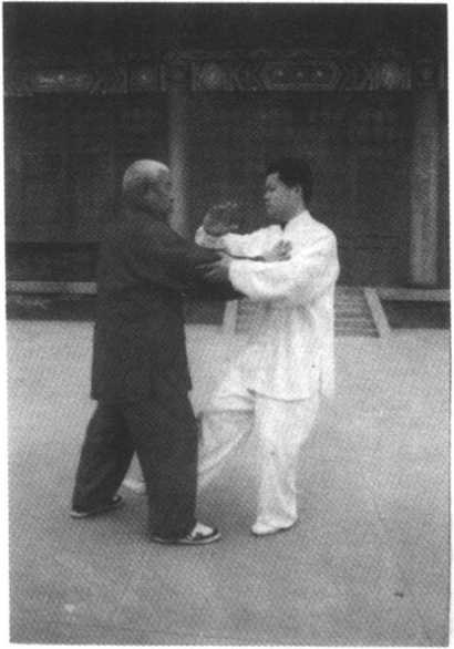 乙方进右步,用右手向甲 面部打来,甲方进右步,用左 手接粘乙右肘部,向右引化, 同时进右手至乙胸部,两手合 力,向前推去,使其后跌(图 62)O